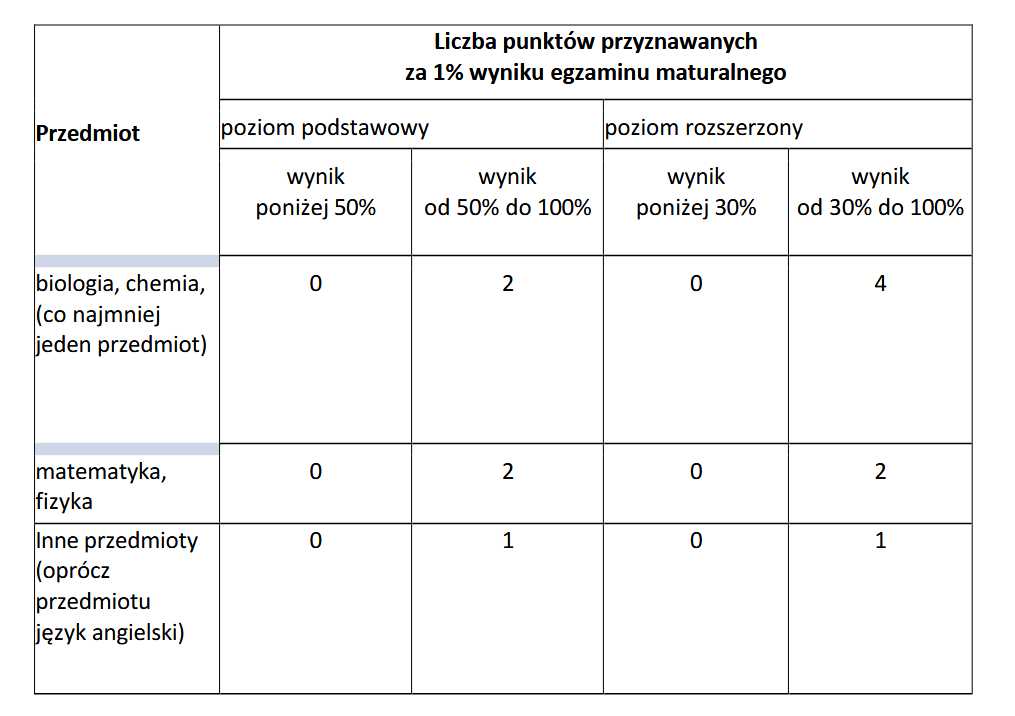 Suma liczby punktów z egzaminu maturalnego (wszystkie zdawane przedmioty na poziomie podstawowym lub rozszerzonym) obliczona wg zasad podanych w tabeli: